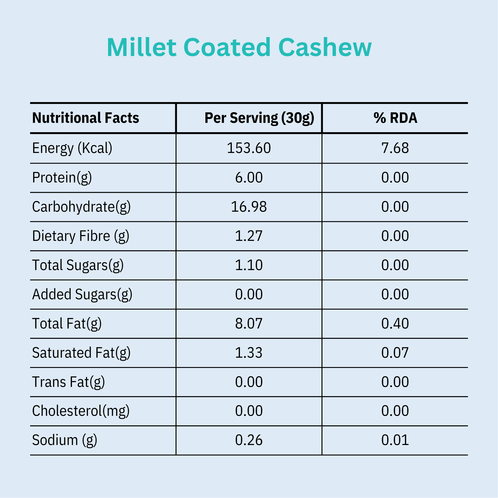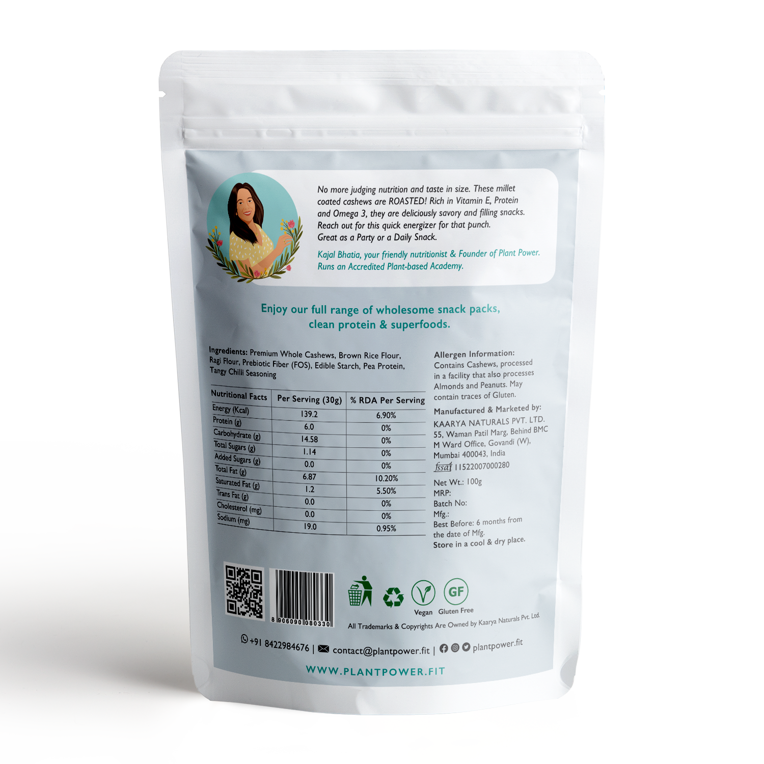 Crafted with care, our cashews are coated with a blend of millet flour and pea protein isolate, enhancing their protein content and providing a satisfying crunch. With a focus on natural nutrition, we ensure that our cashews are roasted, not fried, preserving their wholesome qualities.