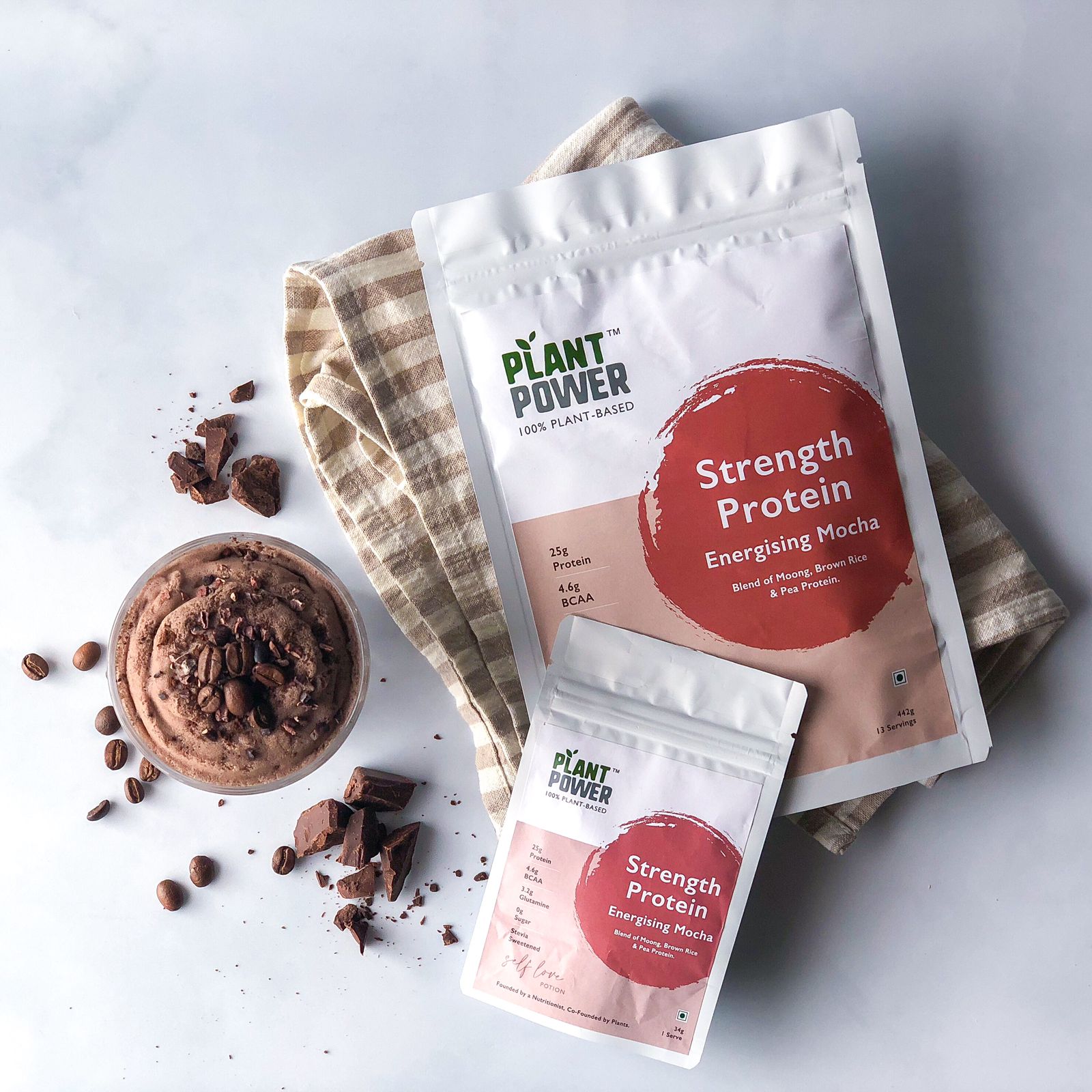 Introducing our Mocha Strength Shake, a powerhouse blend of local moong, brown rice, and pea protein that delivers 25g of pure plant protein per serving. Our philosophy challenges the notion that thickness and creaminess define healthiness. Instead, we prioritize easy digestion, enhanced recovery, and optimal gut health, embracing the intentional lightness of our shake.